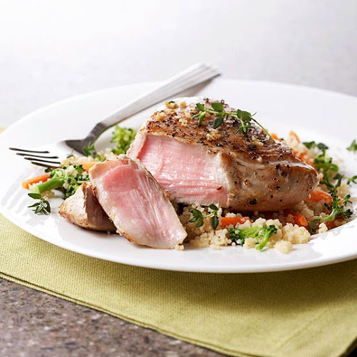 Delicious dinner of lemon pepper tuna steaks served over couscous with broccoli and carrots.