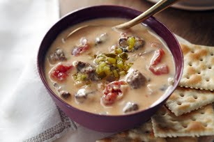 STIR in flour; cook and stir 2 min. Add broth and tomatoes; cook on medium-low heat 5 min. or until heated through. Stir in VELVEETA; cook and stir 8 to 10 min. or until VELVEETA is completely melted and soup is heated through.