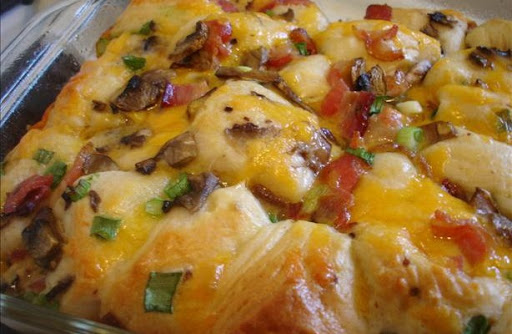 2.Separate dough into 8 biscuits; cut each into quarters. Gently stir biscuit pieces into egg mixture to coat evenly. Fold in bacon, cheese and onions. Spoon mixture into sprayed dish; arrange biscuit pieces in single layer.