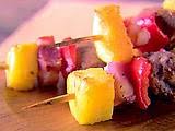 Thread the skewers starting with the sausage, then the red pepper, then the pancetta, then the pineapple. Each skewer should have 2 of these sets. Continue with the rest of the skewers.