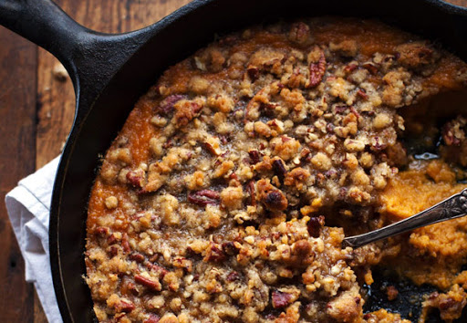 4. Spread crust mixture over the sweet potatoes. Crust should be approximately 1/2 inch thick.