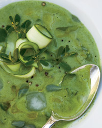 Alain Coumont's cool vegan soup gets its creaminess from pureed zucchini, sautéed onion and garlic. It's brightened with purslane, a lemony weed that Coumont plucks from his Languedoc country garden; if purslane is not available at your local farmers' market, substitute baby arugula leaves instead.
