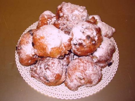 Ollie-bollen, or (Oliebollen) is a dutch pastry similar to a doughnut. It typically is a deep fried pastry filled with raisins and dusted with powdered sugar. Some modern variations serve them topped with berry filling, but this is a traditional recipe. Oliebollen are a traditional treat on New Year's"