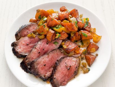 Preheat the oven to 400 degrees F. Put the sweet potatoes in a microwave-safe bowl with 2 tablespoons water. Cover loosely with plastic wrap and microwave until fork-tender, 10 minutes. Combine the sugar and 1 teaspoon each paprika and salt; rub on the steak. Let sit 5 minutes.