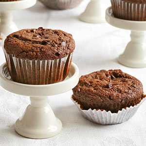 Preheat oven to 375 degrees F. Line twelve 2 1/2-inch muffin cups with paper bake cups; set aside. In a medium bowl stir together flour, granulated sugar, brown sugar, cocoa powder, baking powder, baking soda, and salt. Stir in chocolate pieces. Make a well in the center of flour mixture; set aside.