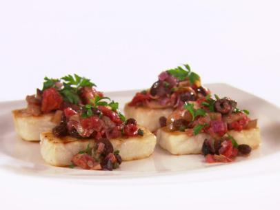 For the caponata: In a large skillet, heat the olive oil over medium-high heat. Add the onion and season with salt and pepper. Cook until translucent, about 3 minutes. Add the celery and artichoke hearts and cook until soft and the artichokes are lightly browned, 3 to 4 minutes. Add the tomatoes, olives, and raisins to the pan. Simmer over medium-low heat, stirring frequently, until the mixture thickens, about 25 minutes. Stir in the vinegar, sugar, and capers and season with salt and pepper, to taste.