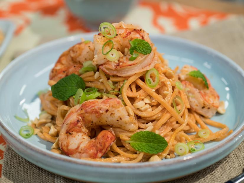Toss half of the peanut sauce with the warm sweet potato noodles straight from the oven. Transfer to a large serving platter. Top with the shrimp, crushed peanuts, scallions and fresh mint and serve with more peanut sauce alongside.
