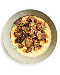 Soak the morels in 1 1/2 cups of boiling water until softened. Rinse and pat dry; reserve the soaking liquid. In a skillet, heat 1 tablespoon of the oil. Add the sausages, cover and cook over moderate heat until no longer pink within; slice 1/4 inch thick. Heat the remaining oil in the skillet. Add the shiitake, season with salt and pepper and cook until softened. Add the shallots and morels; cover and cook for 4 minutes. Add the water chestnuts. Pour in the morel soaking liquid. Add the sausages and simmer for 2 minutes. Stir in the tomato paste. Season with salt and pepper. Off the heat, swirl in the butter and sprinkle with parsley. Serve over polenta.