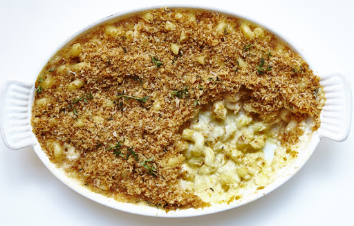 Bring béchamel sauce to a boil, then reduce heat and simmer, stirring, until sauce is thickened and doesn’t feel grainy when a little bit is rubbed between your fingers, 6–8 minutes (cooking the flour thoroughly at this stage ensures a creamy sauce). Add Fontina, Gruyère, cheddar, mustard powder, cayenne, and ¾ tsp. salt and stir until cheeses are melted and sauce is smooth. Remove from heat and mix in pasta; transfer to a 2-qt. baking dish.