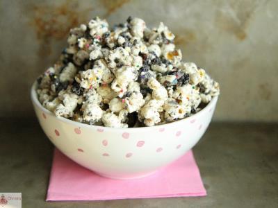 Pour the white chocolate over the popcorn and cookies and gently toss the popcorn until everything is coated and the cookie crumbs are well distributed throughout the popcorn.