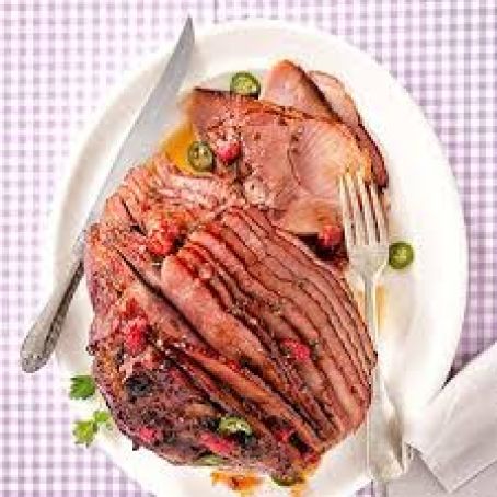 1. Preheat oven to 325F. Place ham, slices up, on a rack in a shallow roasting pan. Set aside. For berry glaze, in a medium saucepan combine reserved ham liquid, orange juice, jam, berries, honey, and jalapeno. Bring to boiling. Reduce heat. Simmer, uncovered, 15 minutes or until syrupy, stirring occasionally. Brush some of the glaze over ham.