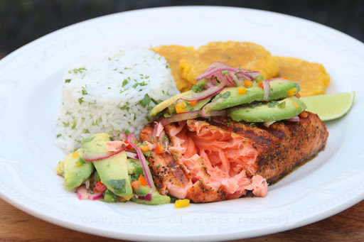 Serve the salmon topped with the avocado salsa, and with rice and patacones or thick green plantain chips on the side.