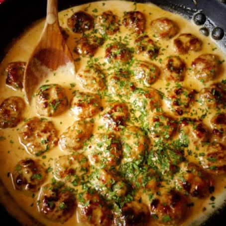 Free-range pork meatballs cooked in butter served with a rich pan mustard gravy. Eat them on their own or turn them into meatball sandwiches.