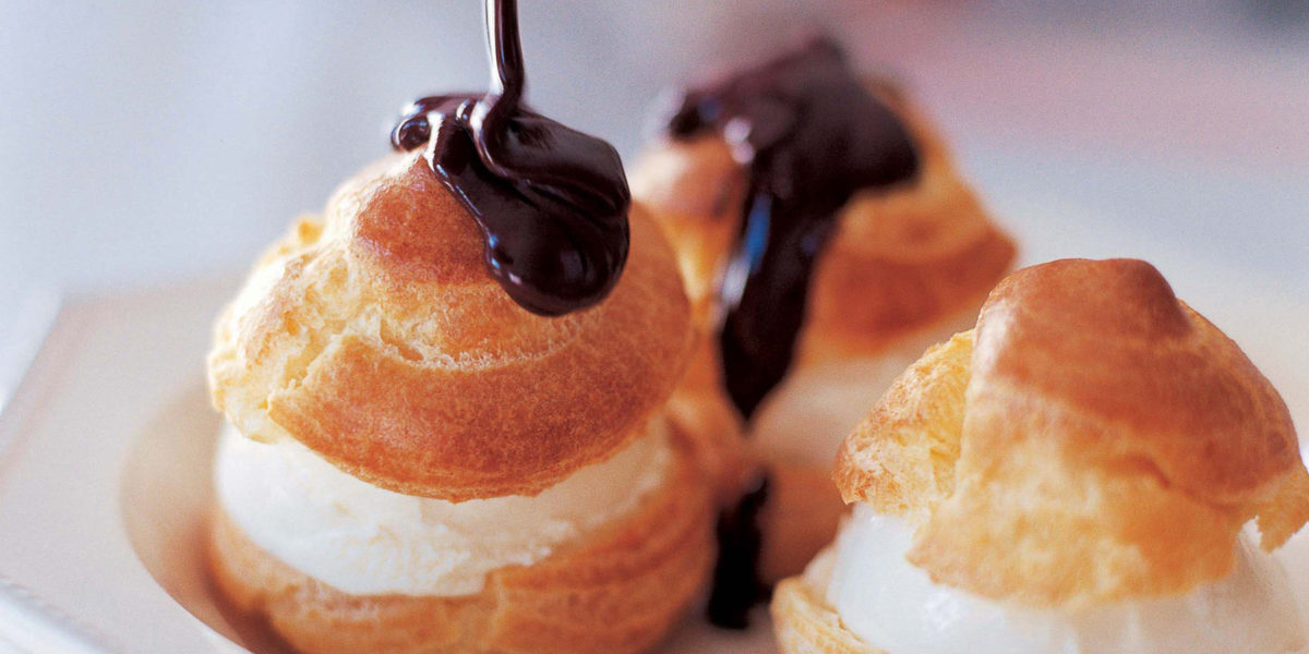 For serving, cut each profiterole in half crosswise, fill with a small scoop of ice cream, replace the top, and drizzle with slightly warm chocolate sauce.