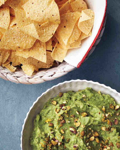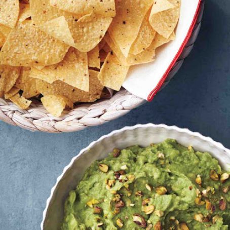Top with remaining pistachios and serve immediately with tortilla chips.