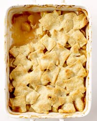 Spread the apple filling in an 8-by-11-inch baking dish and dot with the remaining 1 tablespoon of cubed butter. On a floured surface, roll out the dough 1/8-inch thick and cut it into 2-inch squares. Arrange the squares of dough in a patchwork pattern over the apples, pressing them onto the edge of the baking dish and leaving a few openings for steam to escape.
