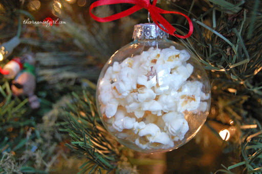 - Plain popcorn. Don’t use the microwave kind, because they are all greasy and will make the inside of the ornament all icky looking.