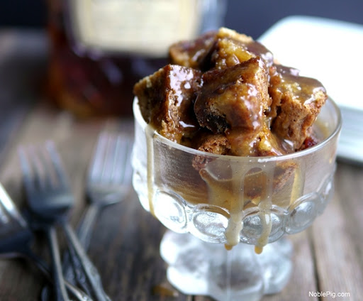For the sauce, over low heat bring sugar, cream and butter to a boil while whisking constantly. Once boiling, let it continue for 2 minutes more while you continue to whisk. Remove from heat and add whiskey and vanilla. (You can easily make this a few hours ahead and just rewarm slightly before using).