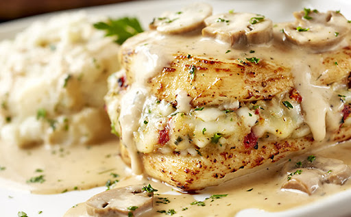 Chicken breasts stuffed with a cheese, breadcrumbs, green onions, garlic, and sun-dried tomato and covered by a creamy marsala-mushroom sauce. A dinner to impress.