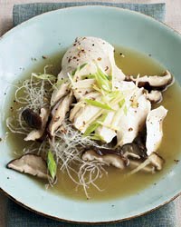 Ladle the noodles, mushrooms and broth into shallow bowls. Top with the sliced chicken breasts, scallions and ginger matchsticks. Sprinkle the chicken with the Sichuan pepper-salt and serve.