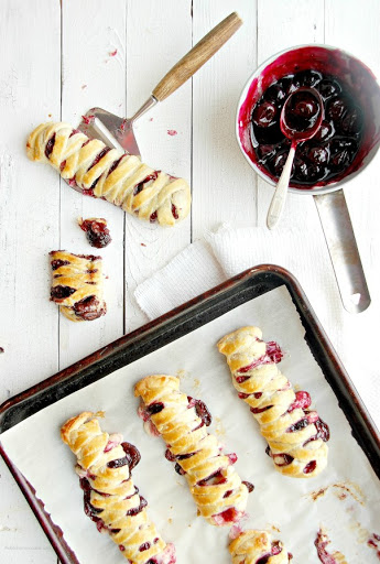 Place about 1 tablespoon of cream cheese filling in the center of the puff pastry and spread out vertically down the middle of the pastry. Place 1/2 tablespoon of Nutella on top of the cream cheese filling and spread out in the same manner. Place 3 to 4 cherries along with a little sauce across the top of the Nutella and cream cheese filling.