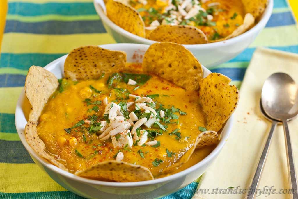 Method Place the two oils and butter in a large saucepan and heat. Add the spring onions and celery and cook until soft. Halfway through, add the 4 spices. Add the carrots and pumpkin and cook, coating them in the mixture for a few minutes. Cover with stock and cook until the vegetables are soft. Blend the soup together with an immersion blender stick. Place back on the heat and add the milk. Once it is heated through, add the spinach and let it wilt in the soup. Spoon into bowls and top with chopped up feta, almond slivers, coriander and a sprinkle of paprika. Place corn chips around the edge and serve.