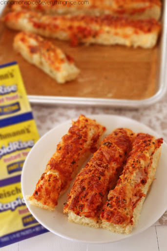 Spray a piece of plastic wrap with vegetable spray and place it over the top of the breadsticks. Place the pan in the oven with a boiling hot bowl or pan of water to help it rise until doubled in size about 30 minutes.
