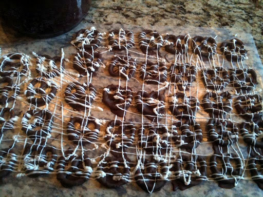 Dip pretzels in chocolate. Wilton makes a neat pronged stick that is great for dipping and really cheap. Lay pretzels out to cool. When hard, heat 1/2 bag of the white chocolate and place in a frosting decorations bag with a small tip. Go back and forth over pretzels to make stripes. Let cool and harden.