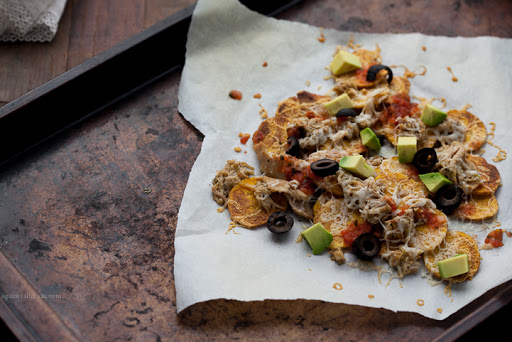 2. Spread the plantain chips in a single layer on a baking sheet. Top with meat and cheese.