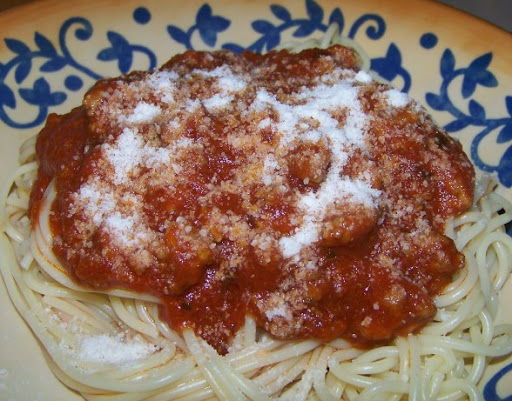 1 In a heavy pot, brown sausage and hamburg, breaking it up into smaller pieces. 2 Add chopped onions and minced garlic and cook till meat is done; add tomato paste and stir until it is mixed in well. 3 Add tomato puree, sauce, and water (when measuring the water, put it into the puree can to rinse it all out and then add to meat mixture). 4 Add basil, brown sugar, salt, parsley, and black pepper and mix well. 5 Add the Parmesan cheese (yes, to the the sauce) and mix it in well. 6 Simmer on low for 2-4 hours stirring occasionally so it won't burn; if you think it needs some thinning down, add about 1/8 cup water at a time; don't add too much because you want it thick so it will stick to your pasta. 7 Cook your spaghetti and enjoy! Eat what you want and freeze the rest in containers that will hold the amount you will eat at a sitting.