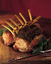 Preheat the oven to 450°. Arrange the racks back to back with the frenched bones crisscrossed and pointing upwards. Roast the racks in the lower third of the oven for 15 minutes. Reduce the oven temperature to 350° and continue to roast for about 1 hour and 10 minutes longer, or until an instant-read thermometer inserted in the thickest part of the meat in the center of one of the racks registers 130° for medium meat. Transfer the racks to a carving board, cover loosely with foil and let rest for 15 to 20 minutes; the final temperature will be 140° to 145°.