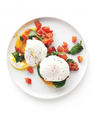 Cook bacon until crisp in a nonstick skillet. Slice polenta into 8 rounds. In 2 teaspoons bacon fat, cook polenta until crisp. Saute tomatoes until collapsed, then add spinach and wilt. Poach eggs. Top polenta with bacon, tomato mixture, and eggs; season.