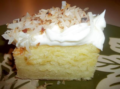 Gently remove the cake from the pan; and cut the cooled cake into 24 squares, and top with frosting and coconut. You can leave cake in pan and frost.
