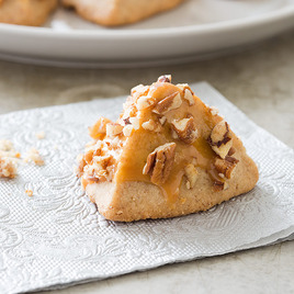 3. Microwave caramels and milk in bowl, stirring occasionally, until melted and smooth, about 3 minutes. Place remaining 1 1/2 cups pecans in shallow dish. Dip point of each pyramid in caramel to coat, then lightly press into pecans. Return to sheets and let cookies set for at least 20 minutes before serving.