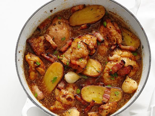 Add the beer, onions, potatoes, mustard, sugar, thyme and 1 cup water to the pot and stir, making sure the chicken is fully submerged. Simmer until the chicken is cooked through, about 15 minutes. Discard the thyme and stir in the bacon and parsley.