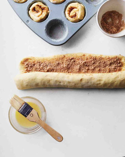 Divide chilled dough in half. Roll out one half (keep other half refrigerated) on a lightly floured surface into a 12-by-7-inch rectangle. Spread half of butter over dough, leaving a 1/4-inch border. Sprinkle with half of cinnamon mixture (it will seem like a lot), patting to adhere. Starting on a long side, roll dough into a cylinder. Pinch edges to seal; trim ends. Cut into 10 disks. Place, cut-side down, in prepared tin. Repeat with remaining dough and filling. Drape with buttered plastic wrap; let rise in a warm spot until doubled in bulk, about 2 hours.