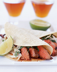 Cut the steak across the grain into 1/4-inch-thick slices. Arrange the meat on a platter. Squeeze 2 lime wedges over the steak slices, then top with the shredded cheese and cilantro. Serve with the warm corn tortillas and the remaining lime wedges.