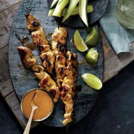 3. Remove chicken from marinade; discard marinade. Thread 3 chicken pieces onto each of 8 (8-inch) skewers. Heat a grill pan over medium-high heat; coat with cooking spray. Add chicken; cook 2 minutes on each side or until done. Serve with sauce, cucumber, and lime wedges.