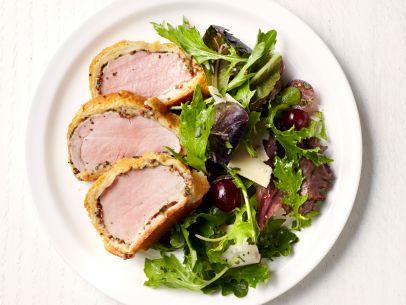 Meanwhile, combine the shallot, vinegar and the remaining 1/2 tablespoon mustard and 1 teaspoon herbs in a large bowl. Slowly whisk in the remaining 3 tablespoons olive oil until emulsified; season with salt and pepper.Slice the pork.