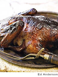 Place the bird(s) breast side down in a roasting pan and baste with the basting sauce. Roast for 1 hour. Being careful not to pierce the skin, turn over, baste, and roast for 30 to 45 minutes, or until an instant-read thermometer inserted in a thigh registers 175° to 180°F (79°C to 82°C).