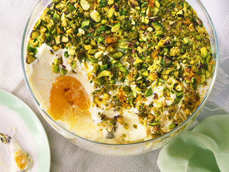 Lay the drained peaches on top of the cake and then generously spoon over the sweetened cream up to the rim of the dish. Sprinkle over the chopped pistachios, tear over the mint leaves, and drizzle with the runny honey. Serve immediately.