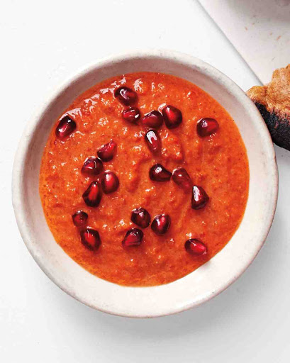 Soak dates in hot water until softened, about 10 minutes; drain. Pulse dates, red peppers, pomegranate juice, walnuts, and red-pepper flakes in food processor until smooth. With machine running, slowly add olive oil until thoroughly combined. Season with salt and pepper. Dip can be stored in refrigerator in an airtight container up to 3 days. Garnish with pomegranate seeds and serve with pita bread.