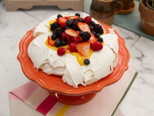 To serve, place the Pavlova on a serving dish. Spread the inside of the crater with a thin layer of lemon curd. Top with berries and serve.