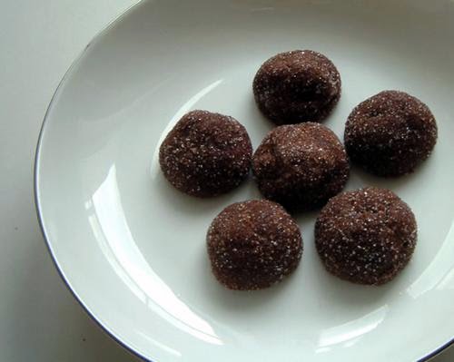Line baking sheet with parchment paper. Use a small ice cream scoop to form the dough into 1 inch balls. Working quickly roll the balls in the granulated sugar. Place on the baking sheet about 2 inches apart. Bake at 325 degress F for about 12 minutes, until the centers are moist but not wet. Cool slightly. Dust lightly with powdered icing sugar.
