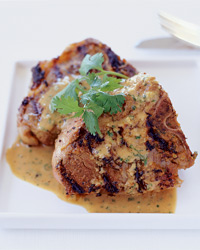 Meanwhile, in a small bowl, whisk the tahini and water with the remaining 2 tablespoons of lemon juice and 1 1/2 tablespoons of olive oil. Garnish the chops with the chopped cilantro and serve with the tahini sauce.