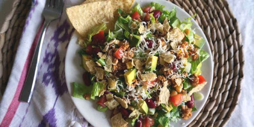 Combine the romaine, kidney beans, tomatoes, cheese, avocados, crushed chips, chicken mixture, and dressing in a large serving bowl. Serve immediately.