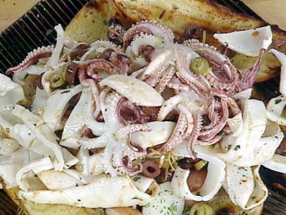 Place the squid on top of the grilled bread and top with the chopped olives. Arrange potatoes decoratively around squid. Lightly drizzle with additional extra virgin olive oil as desired, sprinkle with Essence and parsley, and serve with the lemon wedges on the side.