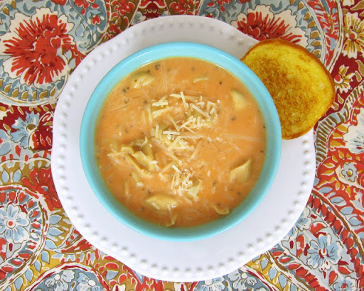 In a Dutch oven, combine the soup, broth, half and half and seasonings. Heat over medium heat for approximately 10 minutes, stirring frequently. Add tortellini to soup. Stir in cheese.