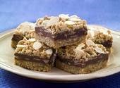 5. Press 2/3 of oat mixture into parchment paper-lined 15-1/2 x 10-1/2-inch (39 x 27 cm) jelly roll pan. Spread chocolate mixture evenly over base. Crumble remaining oat mixture over filling. Sprinkle remaining 1/2 cup (125 mL) almonds on top.