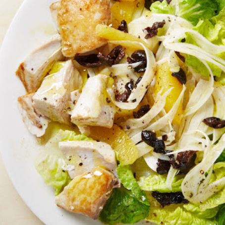 Toss orange supremes, fennel, and olives with lettuce. Top with mahi-mahi and drizzle with olive oil.